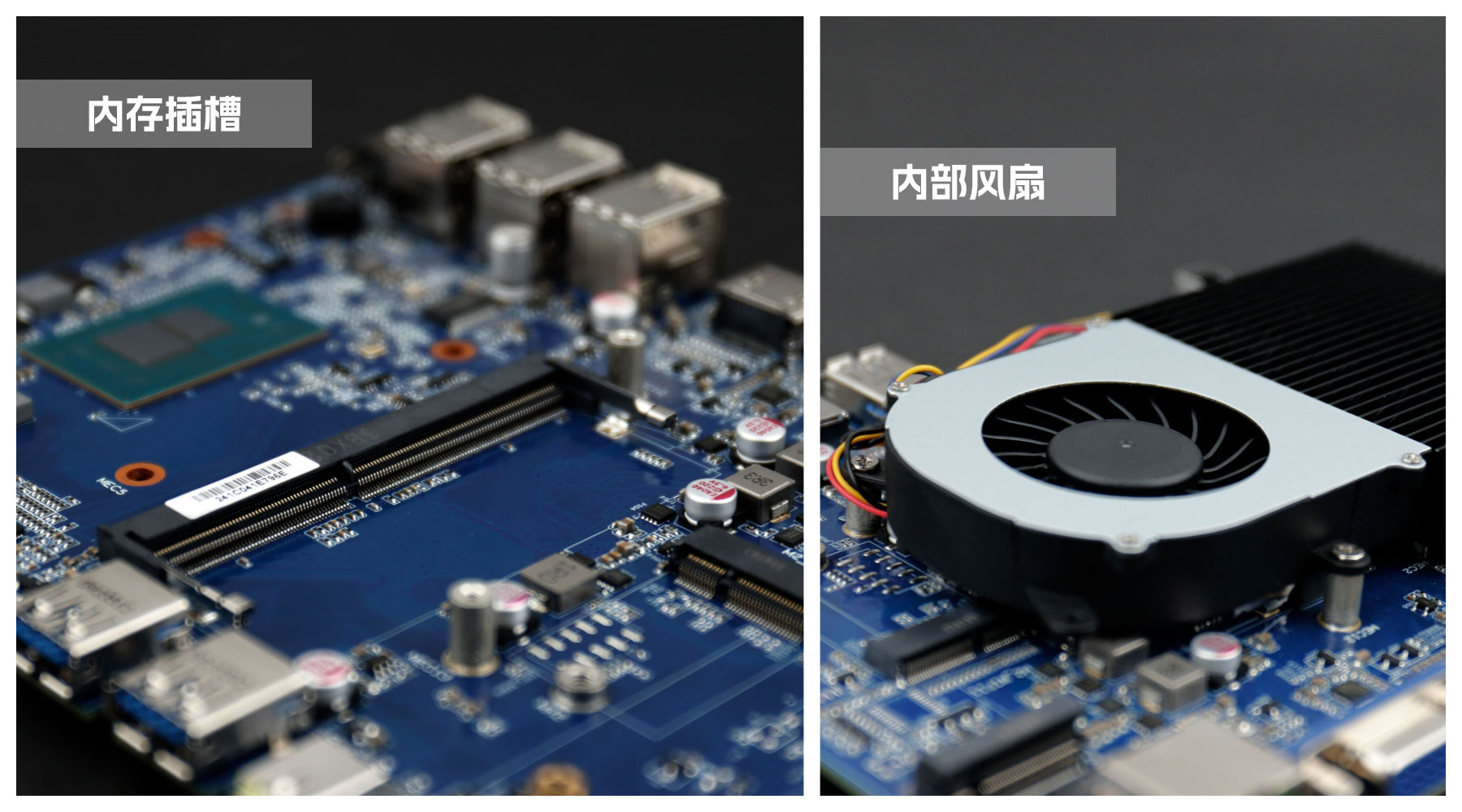 LETOU - 乐投(中文)官方桌面云终端Y-BOX S2主板中部是内存插槽,采用单通道笔记本内存槽设计,最大支持容量可达32GB,最高支持DDR4-3200MHz频率,横插的形式可以减少主板的占用体积,使整体机身更紧凑,内存顶部的风扇起到高效散热的作用。