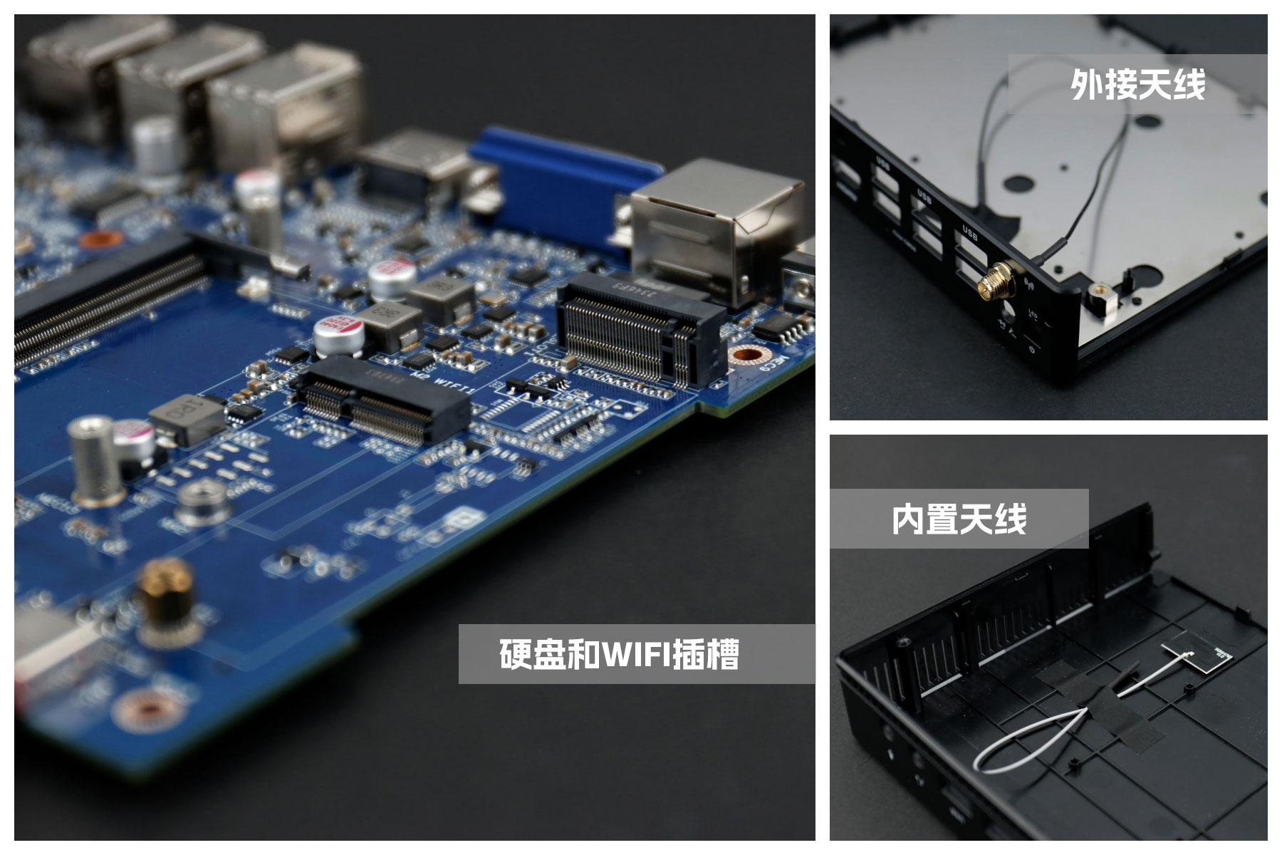 LETOU - 乐投(中文)官方桌面云终端Y-BOX S2主板上配备了 1个 M.2 固态硬盘位,接口规格为 PCIe3.0 标准,匹配标准的 2280 规格硬盘。一侧还有一个M.2接口,匹配2230长度的WIFI/BT模块插槽,WiFi模块可以连接的是外接天线,增强信号,同时也可以内接天线,灵活应用,支持Wi-Fi 5/6/6E网络。