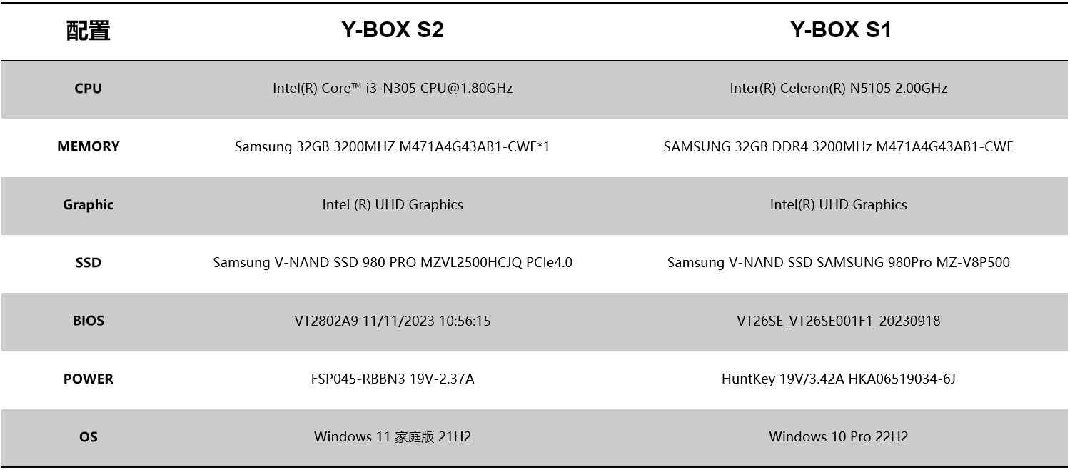 针对桌面云终端Y-BOX S2的测试项目中,最值得关注的是性能测试的跑分数据和稳定性测试内容,这能直观影响主机在使用过程中的稳定性和用户的使用体验。针对性能测试,LETOU - 乐投(中文)官方选择了将Y-BOX S2与前一款更迭产品Y-BOX S1进行对比分析,Y-BOX S2支持Intel® Alder lake-N处理器,Y-BOX S1支持Intel® Jasper Lake,并分别选取了以下配置: