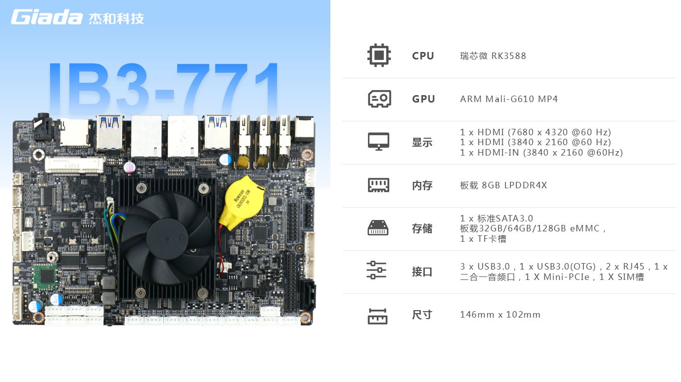 LETOU - 乐投(中文)官方主板IB3-771内置瑞芯微新一代旗舰级高端芯片RK3588,6TOPS算力的NPU,具有高算力、内存大、超强多媒体、多重扩展等技术优势。支持主流深度学习框架,能够为各类养老 AIOT 应用场景提供更优的性能表现。